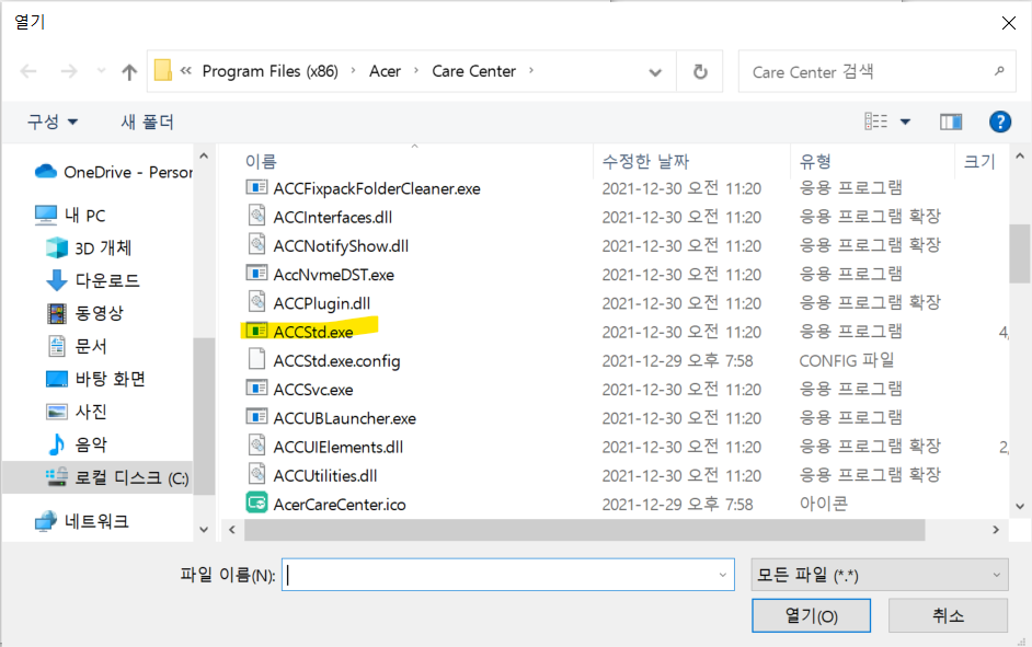 6. 그리고 다음 위치에서 ACCStd.exe 파일을 찾아줍니다. (윈도우10 기준)