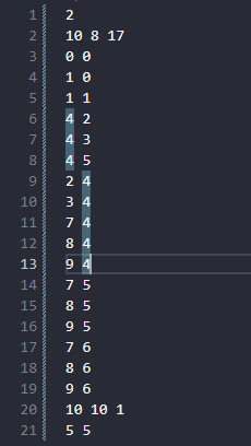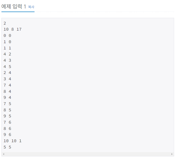 입력의 첫 줄에는 테스트 케이스의 개수 T가 주어진다. 그 다음 줄부터 각각의 테스트 케이스에 대해 첫째 줄에는 배추를 심은 배추밭의 가로길이 M(1 ≤ M ≤ 50)과 세로길이 N(1 ≤ N ≤ 50), 그리고 배추가 심어져 있는 위치의 개수 K(1 ≤ K ≤ 2500)이 주어진다. 그 다음 K줄에는 배추의 위치 X(0 ≤ X ≤ M-1), Y(0 ≤ Y ≤ N-1)가 주어진다. 두 배추의 위치가 같은 경우는 없다.