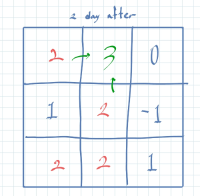 창고에 보관되는 토마토들 중에는 잘 익은 것도 있지만, 아직 익지 않은 토마토들도 있을 수 있다. 보관 후 하루가 지나면, 익은 토마토들의 인접한 곳에 있는 익지 않은 토마토들은 익은 토마토의 영향을 받아 익게 된다. 하나의 토마토의 인접한 곳은 왼쪽, 오른쪽, 앞, 뒤 네 방향에 있는 토마토를 의미한다. 대각선 방향에 있는 토마토들에게는 영향을 주지 못하며, 토마토가 혼자 저절로 익는 경우는 없다고 가정한다. 철수는 창고에 보관된 토마토들이 며칠이 지나면 다 익게 되는지, 그 최소 일수를 알고 싶어 한다.